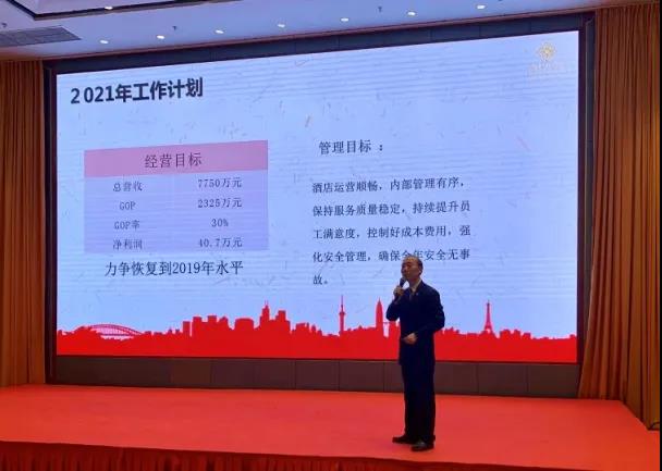 在對(duì)2020年度工作全面總結(jié)中,酒店經(jīng)營(yíng)班子肯定了全體員工在過(guò)去一年的辛勤付出和取得的經(jīng)營(yíng)成效,并對(duì)2021年度工作目標(biāo)進(jìn)行了部署和動(dòng)員。
