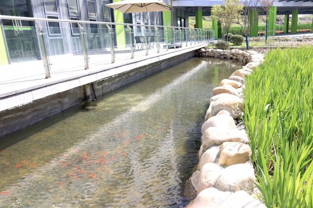 ——教學(xué)樓周邊利用雨水回收系統(tǒng),建有下凹式綠地和景觀魚池,既實現(xiàn)了循環(huán)利用雨水的環(huán)保功能,更是孩子們課間休息玩耍、做科學(xué)實踐活動的好去處。