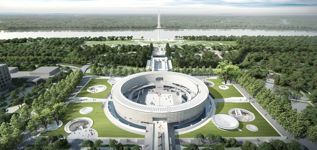 項(xiàng)目建設(shè)范圍總面積約為62000 平方米。建設(shè)內(nèi)容包含憲法展廳及宣誓廣場、法之谷城市綠坡及配套設(shè)施、場地東西兩側(cè)的人行天橋、場地東側(cè)的公園主入口廣場等(場地北側(cè)的濕地公園維持現(xiàn)狀,不做開發(fā))。容積率 0.09,建筑密度 9%,綠地率 36.8%。本項(xiàng)目總建筑面積為 29896 平方米,其中地上建筑面積 5584 平方米,地下建筑面積24312 平方米,建筑高度 16.5米,地上 2 層(首層架空),地下 1 層。功能包含展覽及地下車庫等。