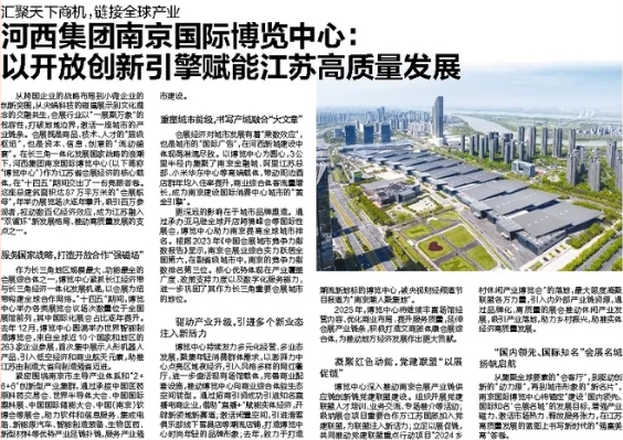 2025年全國“兩會(huì)”期間,揚(yáng)子晚報(bào)全媒體平臺推出《春天的號角》專題報(bào)道,總結(jié)江蘇各地各部門在推進(jìn)高質(zhì)量發(fā)展中取得的新進(jìn)展、新成果,展望新的一年奮進(jìn)路上的新希望、新作為。3月6日,《揚(yáng)子晚報(bào)》刊登河西集團(tuán)南京國際博覽中心深度專題報(bào)道,展現(xiàn)博覽中心在“十四五”期間高質(zhì)量完成規(guī)劃目標(biāo)任務(wù),努力在行業(yè)領(lǐng)域營造更加充分的先行優(yōu)勢,在江蘇高質(zhì)量發(fā)展的藍(lán)圖上書寫新時(shí)代的“強(qiáng)富美高”答卷。