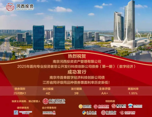 12月15日,河西集團南京河西投資資產(chǎn)管理有限公司(以下簡稱“河西投資”)2025年面向專業(yè)投資者非公開發(fā)行科技創(chuàng)新公司債券(第一期)(數(shù)字經(jīng)濟)于上海證券交易所成功發(fā)行,系河西投資在債券市場的首次亮相。本次債券發(fā)行期限為3年,規(guī)模4億元,利率1.95%,為江蘇省同評級同品種債券票面利率歷史新低。